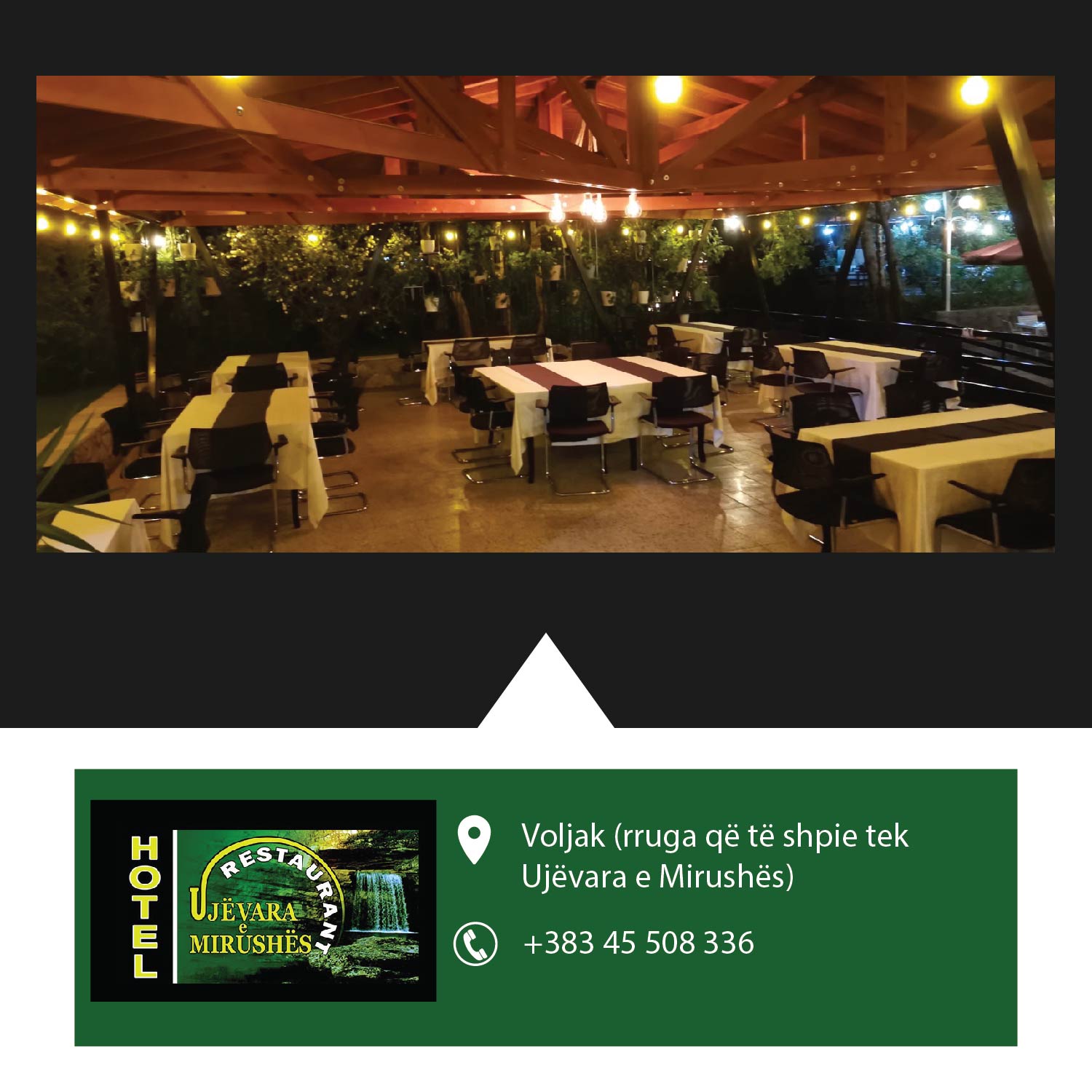 Restaurant & Hotel Ujëvara Mirushës Ushqime fantastike specialitet peshku, meny tradiconale shërbim cilësor dhe i shpejt në hotel dhe restaurant në një ambient të mrekullueshëm buzë lumit Mirusha!!!