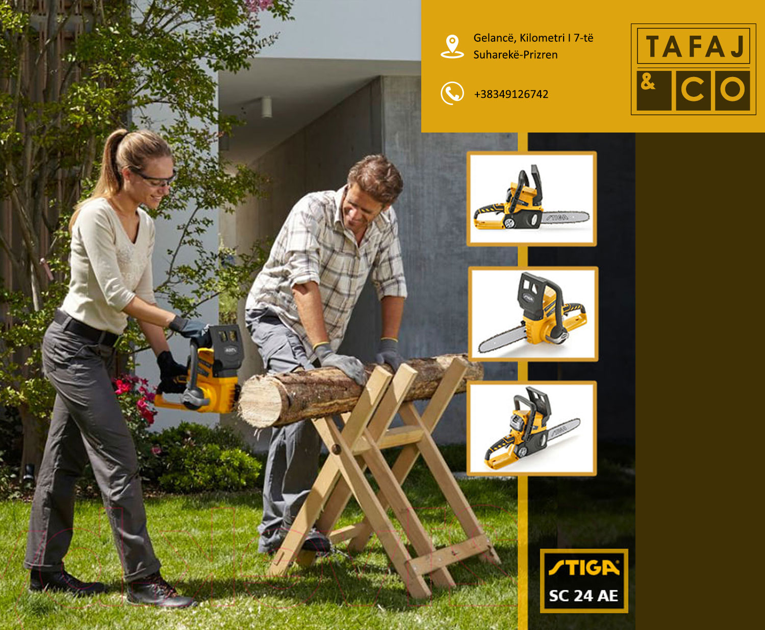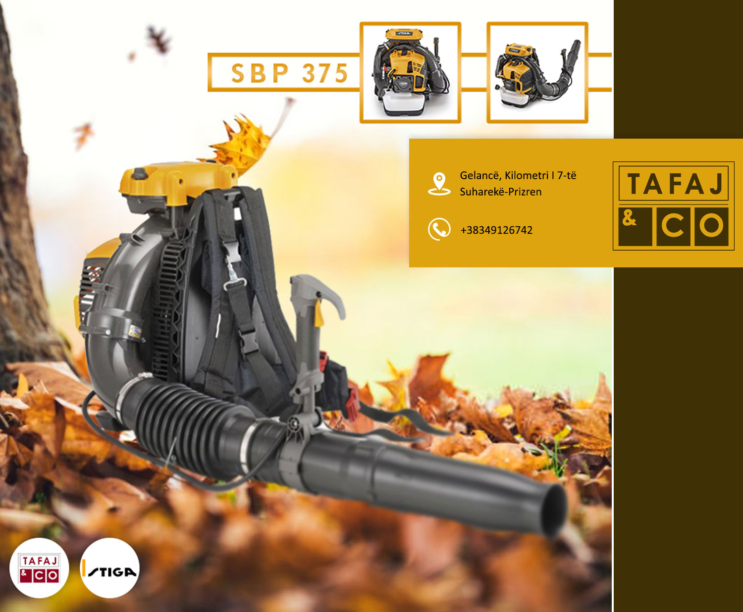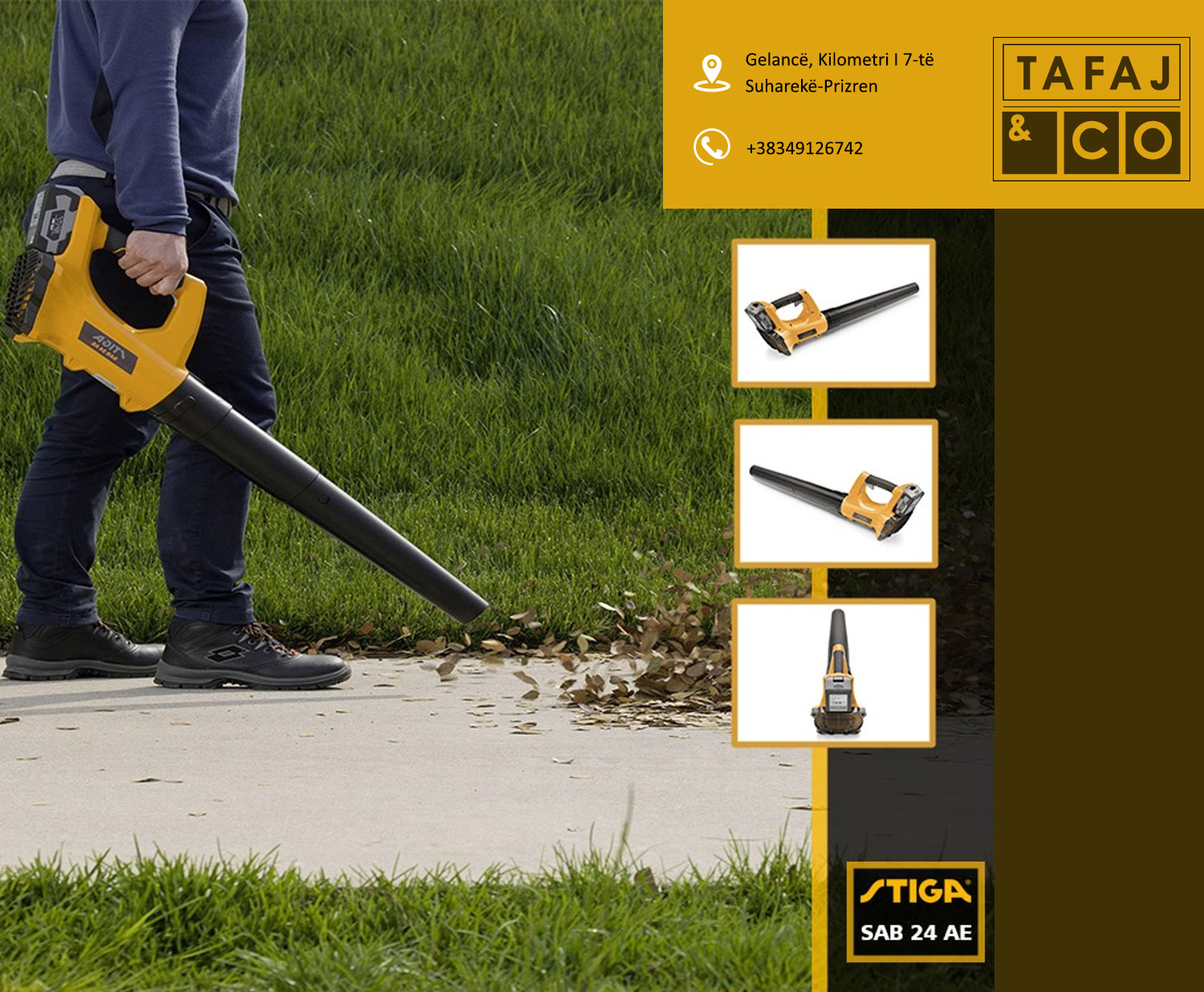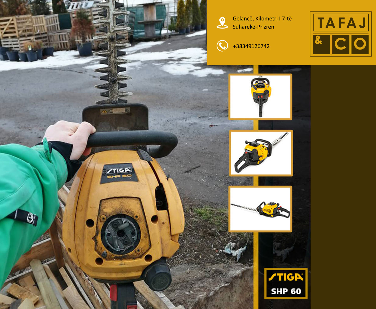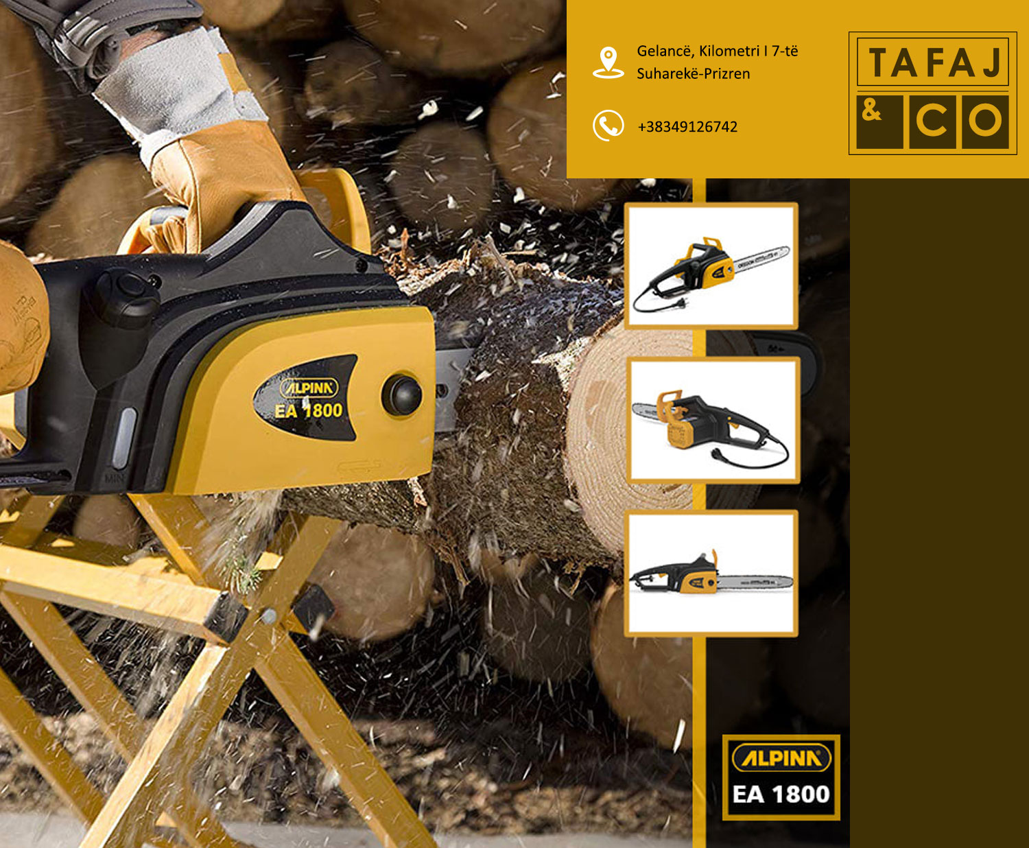 Ndërmarrja Tafaj & CO është një ndër ndërmarrjet më te njohura dhe më të mëdha në vend. Të gjitha produkter tona zgjidhen me kujdes duke ju përshtatur kualitetit dhe dizajneve moderne të kohës. Që nga viti 2001 ndërmarrja Tafaj & Co është në tregun tonë, në fillim të hapjes së biznesit filloi me tregtinë e gjeneratorëve, pompave të ujit dhe veglave profesionale të ndërtimtarisë me cilësi të garantuar dhe kualitet të lartë. Më pas e zgjeroi dhe e vazhdoj punën duke poseduar më shumë se 15.000 artikuj prej më tepër se 50 furnizues të ndryshëm italianë me të drejt ekskluzive për shitjen në të gjithë teritorrin e Kosovës. Tafaj & CO ofron vegla dhe mjete pune të ndryshme për shfrytëzim profesional si vegla të: » Ndërtimtarisë » Mekanikës » Hidraulikës » Elektrikës » Ujësjellësit